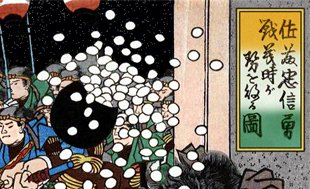 | Sato no Tadanobu was one of the four loyal retainers of the legendary hero Yoshitsune. When his hiding place was betrayed by a former mistress, he defended himself with a Go board against a police force of more than 200 men. | ||
