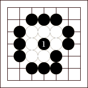 For a group of stones to be captured, all the intersections touching the group must be filled. The group must not only be surrounded on the outside, but empty spaces inside the group adjacent to the stones must be filled also. A single empty space inside a group is called an eye. Indeed, by the end of the game, for a group to remain alive it must contain at least two separate spaces. One of the key themes in Go battles is creating eye space for your own groups and trying to prevent the opponent from making eyes.