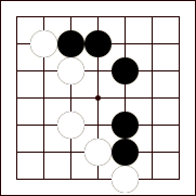 counting the score. Diagram 10: (moves 27 - 32) The fighting is over and the players fill in the last empty spaces (called dame) between their armies. After move 32 there is nothing more to be done. Note that two White stones are trapped behind the Black wall. Black does not need to play another move to capture these stones because they no longer can make any threat. As you will see, it will be bad for Black if he does capture! Diagram
