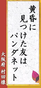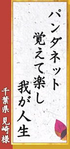 - ※ご応募いただいた川柳につきましては、入賞作品または入賞作品以外でも、後日のパンダネットメールマガジンや、ホームページ上、抽選プレゼントの特製カレンダー等、パンダネット運営内の催しにて使用(作品をご紹介)させていただく場合がございます。ご了承くださいます方のみご応募ください。