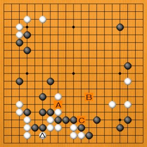 下辺で白が△にワタった場面です。ここで次の一手を考えてください。黒Aとワリコんで禍根を断つか、Bと広く構えるか、Cと断点をツグか。