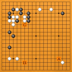 左上で際どい接触がありました。この場面で次の一手を、A~Cの選択肢の中から示してください。