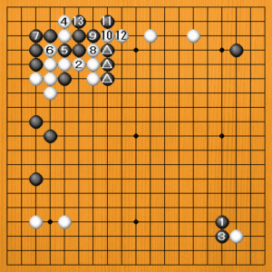 黒1に白2とツギましたが、ここで黒3と連打するのは、白4のサガリから、一本道で白8、10の出切りが強烈です。黒△の三子が分断されますから、これは黒がいけません。