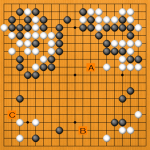 黒に手番が回って、チャンスが訪れています。次の一手をA~Cの選択肢の中から示してください。