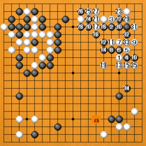 白29から31とワタったのが小さく、白29ではaと右下の黒を攻めた方がよかったでしょう。黒に手番が回って、黒34、白35を利かしたところです。