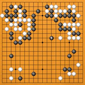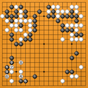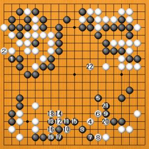 下辺黒3のヒラキに回りました。白22のトビは白が占めましたが、白にとっては地にならないところです。黒は実利のいいところを先に打ち、白には実のないところを打たせて、黒がうまく立ち回りました。