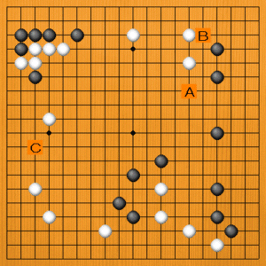 黒の三連星から、模様が出来ています。次の一手をA~Cの選択肢の中から示してください。