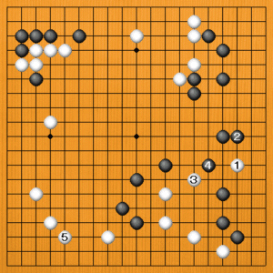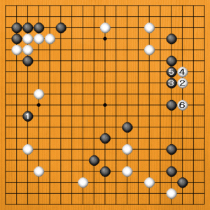 白1の打ち込みに黒2とサガられると、白3から捨てるくらいです。右辺の黒が大きく見えますが、それほどでもありません。もしろ、白5とシマって左辺の白が大きいのです。黒の大きな地は右辺の一か所ですので、黒がやや甘い碁になりました。