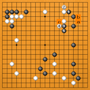 黒1(C)は方向が違います。やはり、右辺の黒模様が大切なところで、白2に打ち込まれると、すっかり荒らされてしまいます。これでは失敗です。