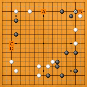 黒△に受けたところです。次の一手を、A~Dの選択肢の中から示してください。