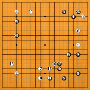 テーマ図までの手順です。黒13のトビから17の受けまで、黒は右下にこだわり過ぎています。まだ布石の段階ですから、他の大きなところに向かった方がいいでしょう。