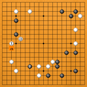 もう一つ上に、白1(C)とツメるのが正解です。この方が、黒二子に対して厳しいのです。黒2などと深く踏み込んで来られても、白3とケイマに煽る好手が生まれます。白1がaでは、次の厳しい手がありません。