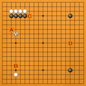 白△にハサまれたところです。次の一手を、A~Dの選択肢の中から示してください。