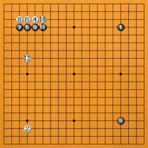 白4の目外しに対して、黒5とカドに打ったのは変則的です。白も12のハサミはいけません。もっと大事なところがありました。
