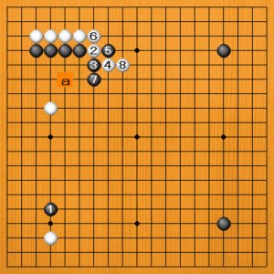 黒1(B)とカカるのも大場ですが、白2と頭をハネられてしまいます。黒3のハネには白4の二段バネが気持ちのいい手です。白8のノビまで上辺で白が好形になりました。黒はaに弱点が残っていて、窮屈な形です。