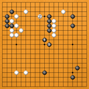 黒1(A)のケイマが、この局面のヘソです。上辺の黒の四子が頭を出して安全になり、同時に競り合っている白が弱くなります。また、左辺の白模様を消しながら、右下の黒模様に応援を送っています。
