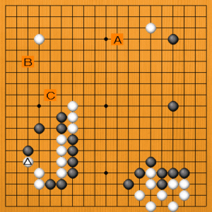 白が△に打った局面です。次の一手を、A~Cの選択肢の中から示してください。