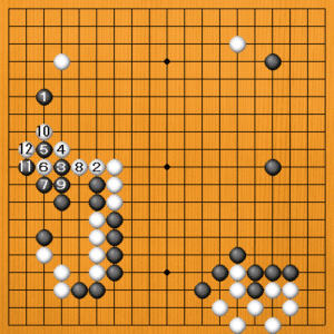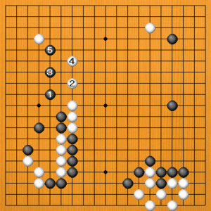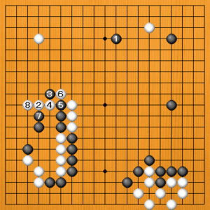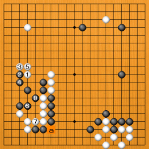 白1には、黒2、4のツケ引きで死ぬことはありませんが、白5まで左辺が強くなり、白7のオサエがきて、白aの切りも残ります。黒は生きるだけで、周囲に悪影響を及ぼしました。