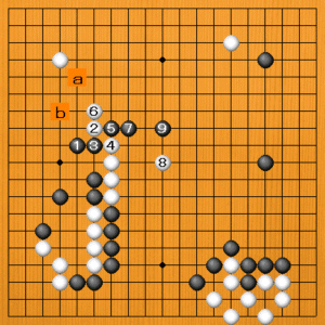 黒1のケイマで安定すれば、あとは強く戦うことができます。白2とカケてくれば、堂々と黒3、5と出切ります。白8と中に出て行けば、黒9と追って、黒石の多いところで戦います。左辺の黒は不安がありませんから、後に黒aとカケてカラんでいくのも有力ですし、黒bと地を増やしながら白に迫る作戦もいいでしょう。