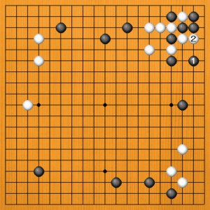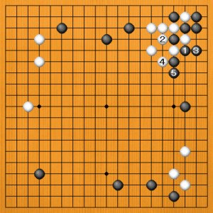 黒1に白2と抜けば、黒3とサガってワタります。白4のフクレに黒5とノビれば、黒がいい形になりました。