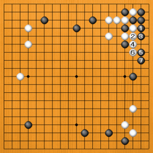 黒1には白2とツギます。黒3から5とトベば右辺にワタることはできますが、何でもワタればいいというものではありません。白4、6と出て白が厚くなりますし、黒7までワタった形が低くて、とても美しい姿とは言えません。