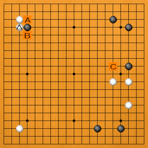 黒1(C)のトビは、部分的には素晴らしいところですが、今は左上で競り合っていますから、他へ向かうのはソッポを向いた悪手になります。白2のハネを許してはいけません。黒3と逃げても、白4と追われて、黒が苦しくなります。