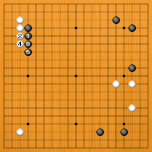 黒1、3と石が下に向かうのは、さらにいけません。白4のカケツギで白の姿がよくなります。黒5まで、早く治まりたい気持ちは分かりますが、石は上に行ったほうがいいのです。のびのびと美しい形で打ちましょう。