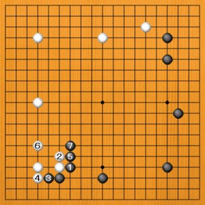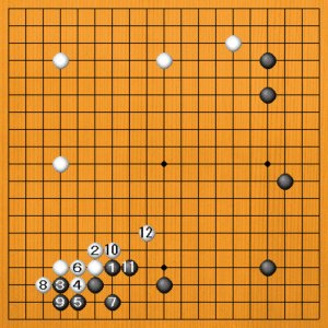 黒1のハネのあと、3とツケるのは、定石選択を間違えています。白4のフクラミから12のケイマで一段落ですが、黒の構えが低くなって、模様がしぼんでしまいます。逆に左辺の白模様のスケールが大きくなりました。
