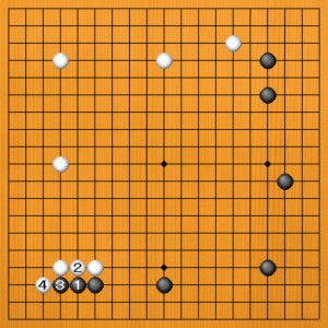 黒1(B)のノビは、白2と上をツガれて白が厚くなります。黒3と隅に潜っても、模様を張り合う展開には、そぐわないでしょう。白4とオサえられて、黒が冴えない姿です。