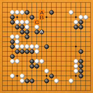 黒が△とノビたところです。次の一手を、A~Cの選択肢の中から示してください。