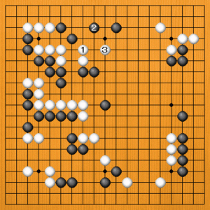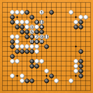 白1には黒2とコスミツけて、白の出口を止めてくるかもしれません。白3のツギに黒4で止まりますが、白5、7の出切りで反撃します。黒8のアテから12まで連絡しなければなりませんから、白13と切って上下が見合いになります。黒2、4の強硬手段は、怖くありません。