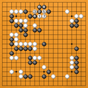 白1(B)と高く臨むのは、黒2の下ツケでワタられます。白3から5とアテても、黒8まで事件は起こりません。