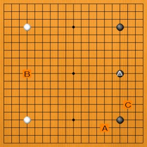 黒が△と三連星に構えたところです。次の一手を、A~Cの選択肢の中から示してください。