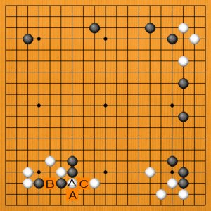 白が△と切ったところです。次の一手を、A~Cの選択肢の中から示してください。