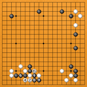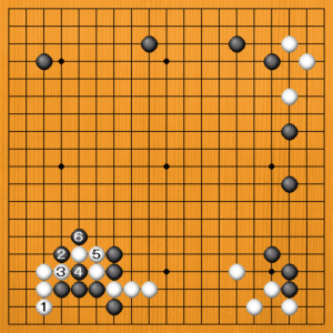 白1などと眼を取りにくれば、黒2のツケコシで突破します。白3、5と抵抗しても、黒6までシチョウです。