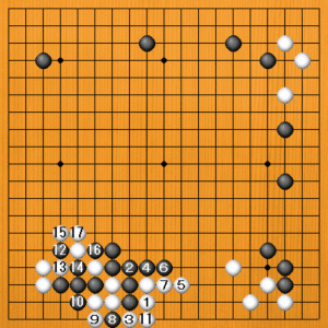 白1とオサえれば3とワタる手順になりますが、黒4、6を利かして、中の黒が厚くなります。黒8のホウリコミから10のオサエを利かしてから、12とツケコします。黒16と抜いて連絡すれば、黒はしっかりした形で不安はありません。