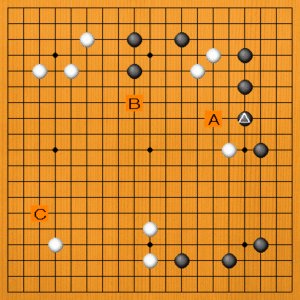 黒が△に受けたところです。次の一手を、A~Cの選択肢の中から示してください。
