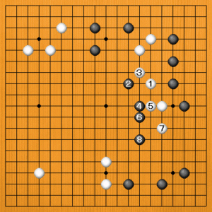 白1(A)のケイマは、白石がつながってよさそうに見えますが、黒2と外側から迫られると、白の動きが不自由になります。白3と連絡すれば、さらに黒4と煽ってこられるでしょう。白5の手入れも必要です。白7のトビに黒8とトンで、いつの間にか中央に黒石がたくさん並びました。白は連絡しただけで、働きに乏しい姿です。