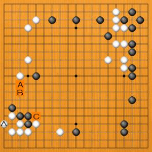 白が△と抜いたところです。次の一手を、A~Cの選択肢の中から示してください。
