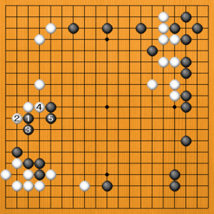 黒1のツケはいいのですが、白2に黒3とノビたのでは追及不足です。白4のブツカリを利かされて、黒5と伸びた形にはまだ不安が残ります。サバいた形とは言えません。