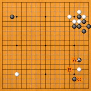 黒が△とハサんだところです。次の一手を、A~Cの選択肢の中から示してください。