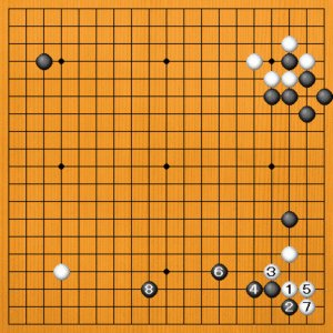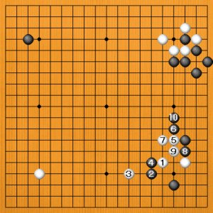 白3のハサミから5、7とツケノビるのが形ですが、黒10の構えまでとなって、左右の白が治まるまで大変でしょう。ここで戦うのは、局面に合っていないのです。