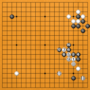 白1(A)のツケが正解です。黒2、4と受けるくらいですから、白5、7と二段にハネて筋にハマっています。黒10まで右辺が黒地になりますが、このくらいならたいしたことがありません。元々黒が固いところですから、さらに固めさせても痛くないのです。続いて、白11と右下の黒に迫ります。黒12と取られても、白13とさらに隅に向かって、白が好調です。