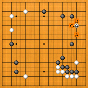 白が△とカカったところです。次の一手を、A~Cの選択肢の中から示してください。