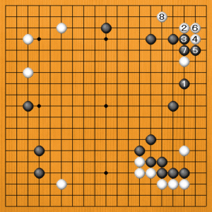 黒1(A)ツメは、白2と三々に入るのがいい手になります。黒3からさえぎって右辺の厚みを囲うことになりますが、白8のスベリまで楽に治まらせてはいけません。