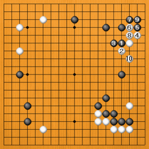 白4と中にトンで逃げるくらいですから、ここで黒5とノゾいて白石を重くします。白石を太らせてから、黒7とボウシしてどんどん攻めていきます。白8のマゲには黒9のトビが厳しくなります。右下の黒の厚い方向へ白石を追い込んで、黒の攻めが調子に乗ってきました。