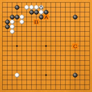 黒1(C)の三連星は、白2と本線を切られて困ります。黒3とノビれば、白4とタタかれて堪りません。