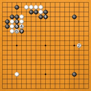黒1には白2と整形するくらいです。この交換をしてから、黒3の三連星に向かうのが落ち着いた手順です。黒1とツイだ上辺の構えが、三連星と連携しています。