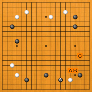 黒が△とハサんだところです。次の一手を、A~Cの選択肢の中から示してください。