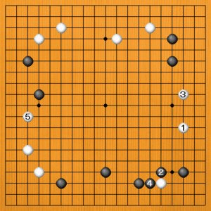 白1(A)のトビは、黒2とケイマに受けられて、白にいいことがありません。黒に左右から迫られて、窮屈な姿です。白3と押しても黒4とノビられて、打てば打つほど黒の調子がよくなってきます。